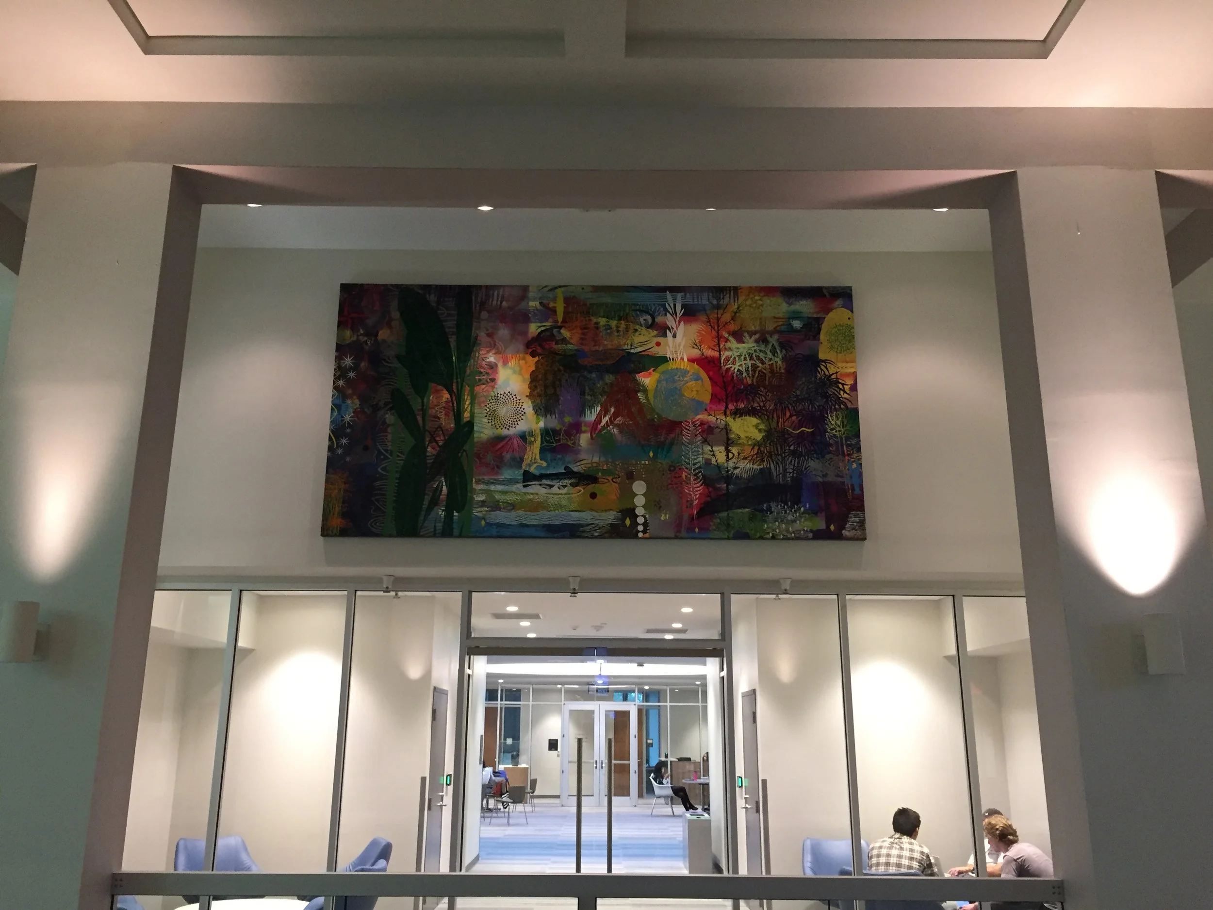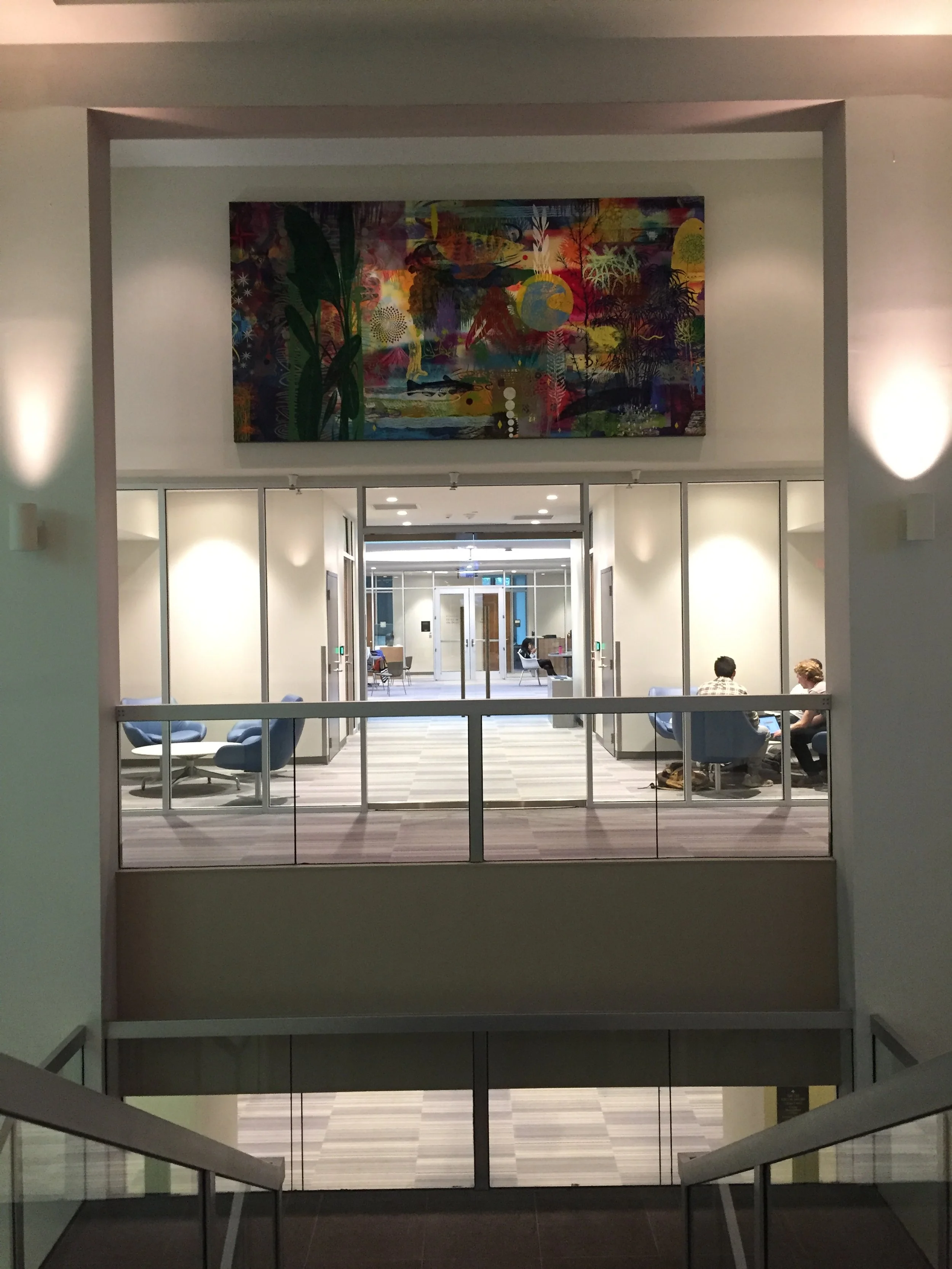 My large painting, "Vengolden," is prominently displayed on the 4th floor, offering a vibrant focal point within this dynamic educational setting. Measuring 6 feet high by 15 feet long, the artwork complements the building's contemporary aesthetic and contributes to the enriching visual experience for students, faculty, and visitors.