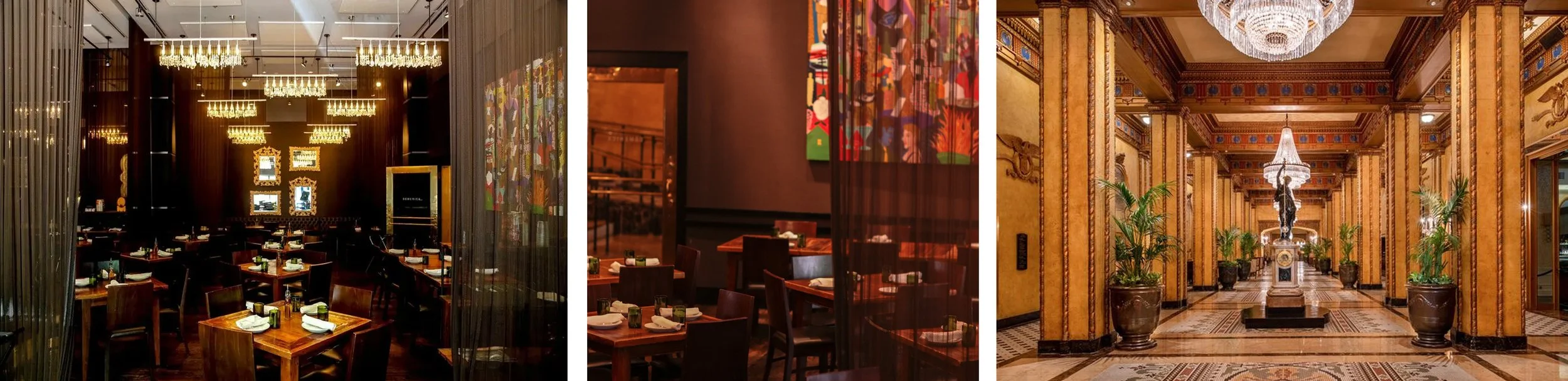In the more intimate private dining area, the smaller Barking Dogs (3 feet x 9 feet) triptych provides a distinct artistic presence. This piece complements the exclusive and comfortable ambiance of the private space, often used for special events and gatherings