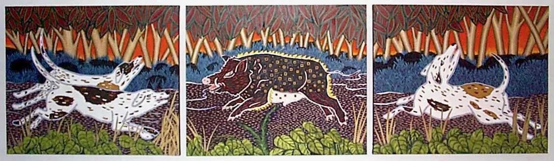 “Boar and Barking Dogs" 3’ x 9’, triptych - Private Dining Area