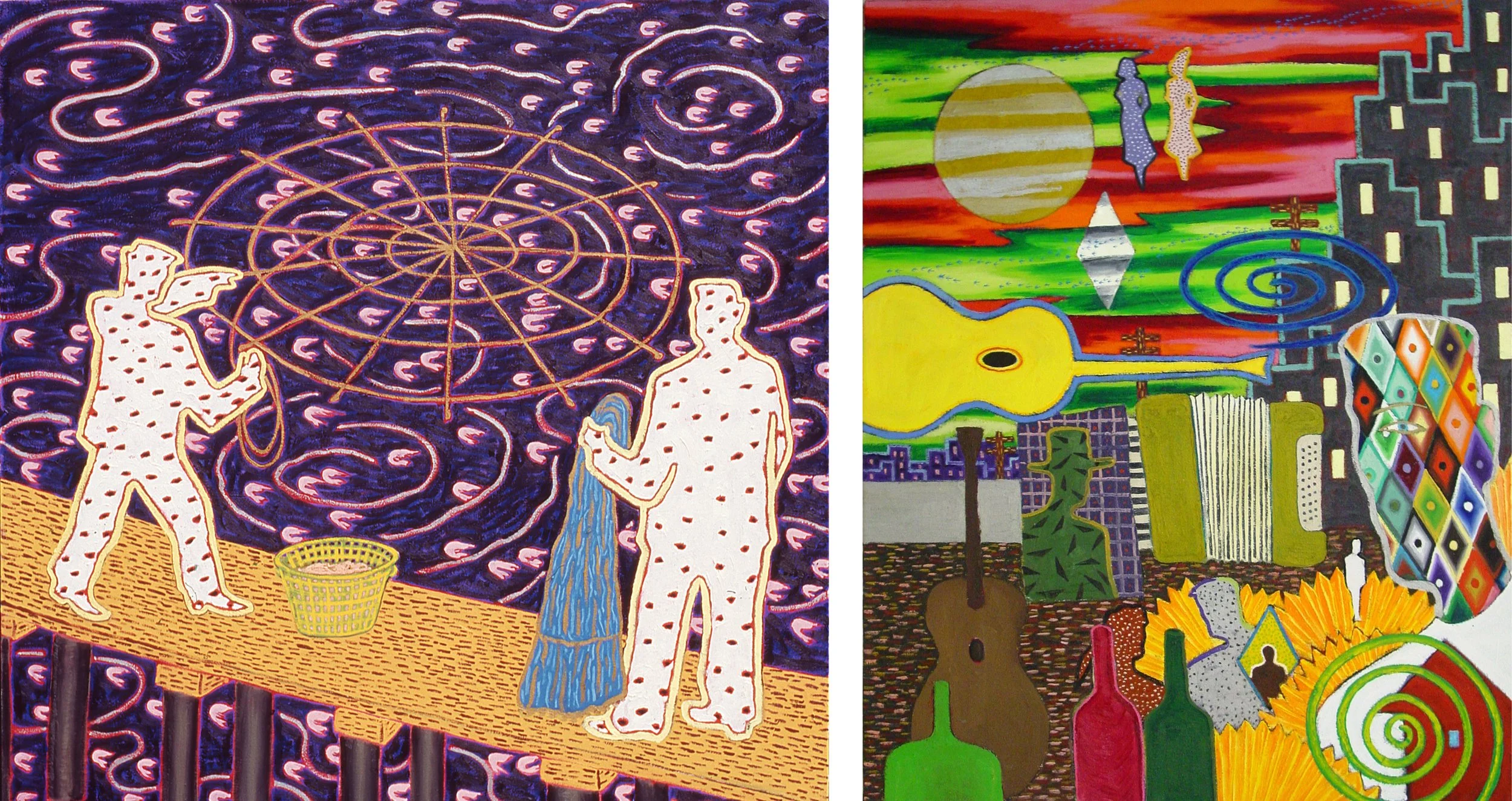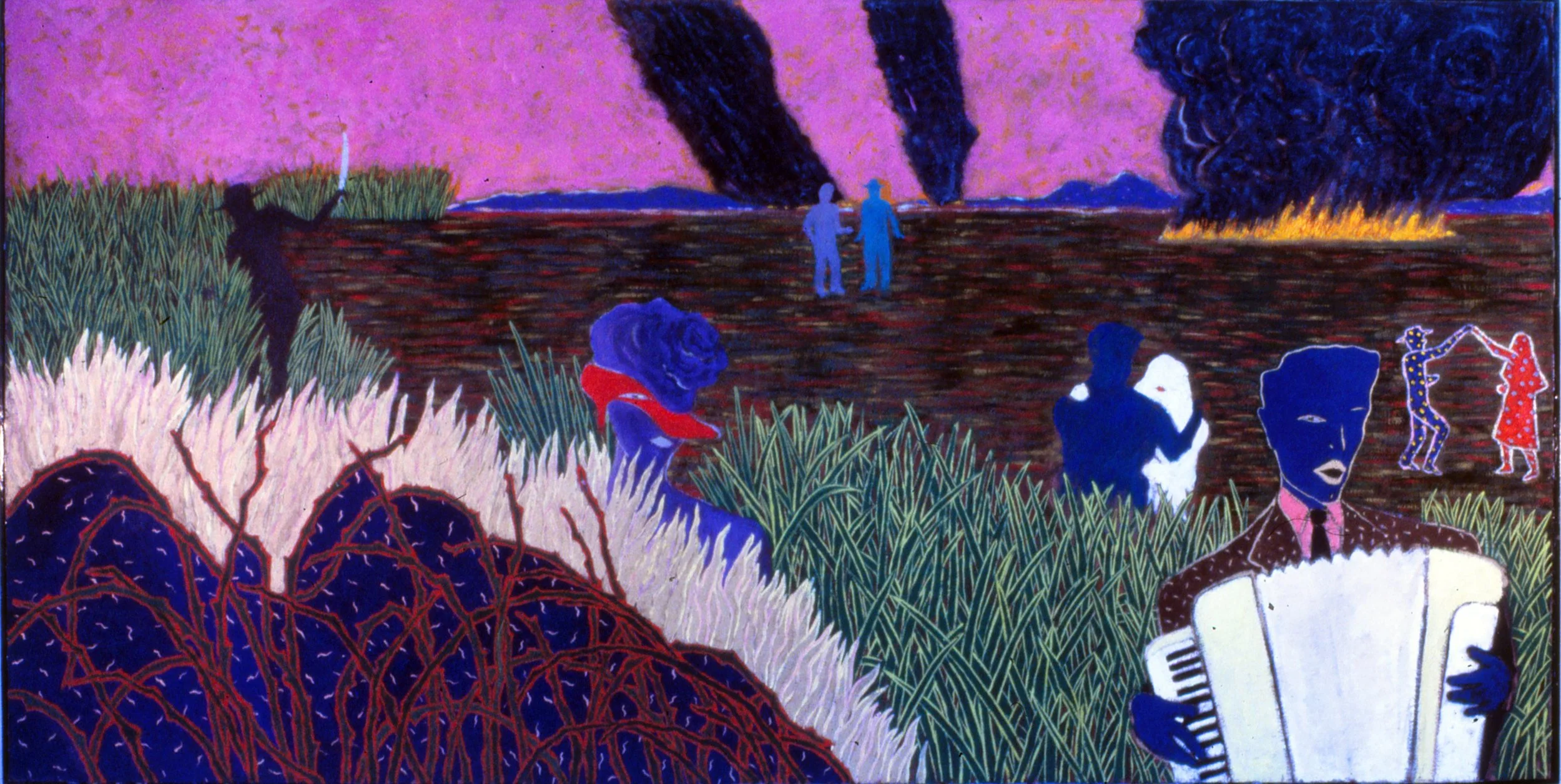 Canfield Burning presents a narrative landscape. In the foreground, briars burn. Several mythical figures occupy this space: a woman wears a shoe mask, and two men talk in the distance. A couple dances, and a man cuts cane. An accordion player sits in the foreground, to the right.